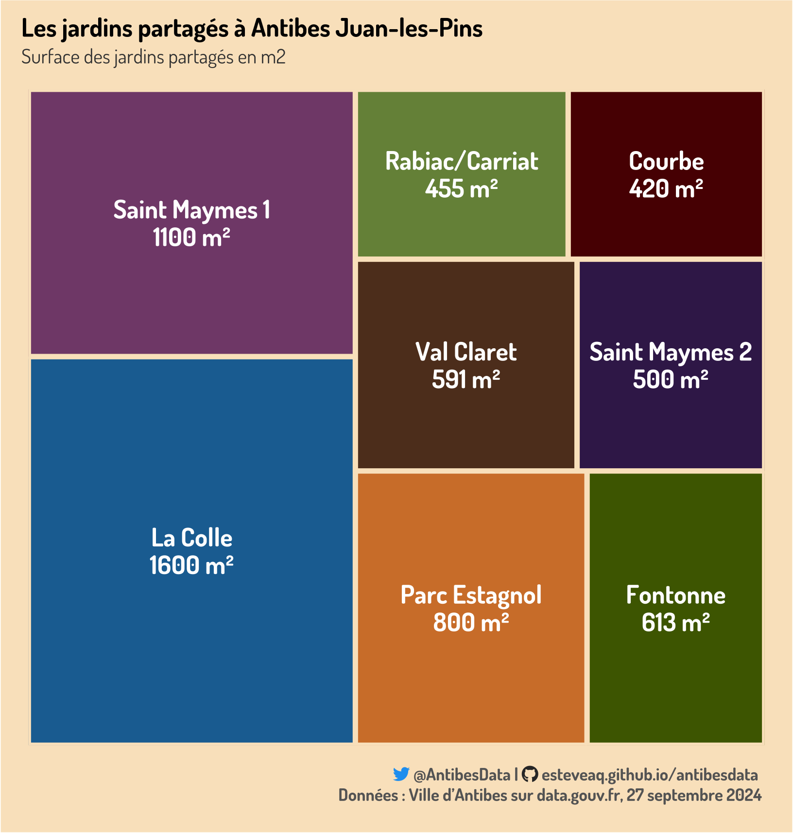 Ce poste rend compte de la surface des jardins partagés à Antibes Juan-les-Pins. Chaque rectangle est proportionnel à la surface en mètres carrés.